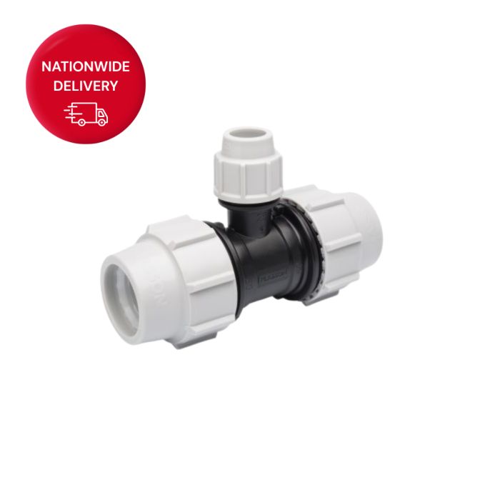 The Plasson 7340 reducing tee offers a 90-degree branch connection, allowing you to seamlessly connect a smaller diameter pipe (32mm) to two larger diameter pipes (63mm) in your piping network. This makes it ideal for systems where flow needs to be split or diverted efficiently while maintaining system integrity.